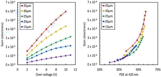 Figure 8, left, shows a plot of the gain as a function of the overvoltage for the different NUV-HD cell sizes. We define the gain as the average number of carriers passing through the high-field region of one cell when a photon or a dark count is detected, and no correlated noise event takes place [18]. As expected, gain increases with cell size, being proportional to cell capacitance. We also observe that, because depletion at VBD and above VBD are significantly different in NUV-HD technology, gain is less than linearly proportional to the overvoltage. From the measured gain values, we calculated a microcell capacitance, CT, ranging from 18 fF to 107 fF, for the 15 um and 35 um cells, respectively, at 6 V of OV. On the other hand, Figure 8, right, shows a plot of Gain vs. PDE measured at 420 nm. In this plot, differences between cell sizes are reduced because, although smaller cells feature a lower capacitance, they also need a higher value of OV to reach the same PDE as larger cells.