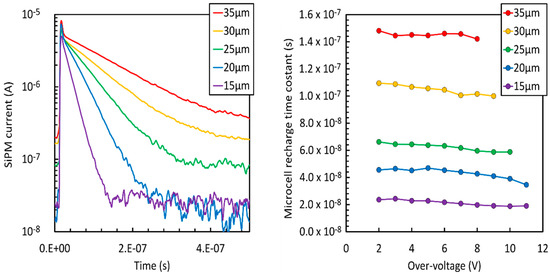 Figure 9, left, shows the current signals generated by 1 × 1 mm2 SiPMs with different cell sizes operated at 6 V overvoltage, when an avalanche was triggered in a single cell. The curves were measured using a fast, transimpedance amplifier, similar to the one reported in Reference [7]. The almost exponential trailing edge of the pulses is generated by the passive recharge of the microcells [21] and is independent on the amplifier response and on the detector active area, which, by contrast, mainly affects the rising edge of signals. In the plots, it is also possible to observe a fast peak on the rising edge generated by the capacitive coupling between anode of microcells and SiPM metal grid.
