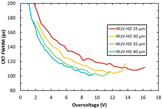 In the measurements, two 4 × 4 mm2 NUV-HD SiPMs were coupled to 3 × 3 × 5 mm3 LYSO(Ce) crystals for the detection of 511 keV gamma-photon emitted in coincidence by a 22Na source. We observe that, at low OV, CRT improves because SiPM Gain and PDE both increase with increasing OV, thus improving SNR with respect to electronic noise and photon time of arrival statistics, respectively. The effect of photon time of arrival statistics is described, for example, in Reference [1]. At any given value of OV, the performance of larger cell sizes is better because of a higher PDE and gain. However, the curve related to the 40 µm cell stops at 9 V because of the rapid divergence of the correlated noise, thus preventing further PDE and CRT improvements. A similar behavior is also observed in the other cell sizes, but, as expected, OVmax is shifted to higher values, effectively reducing the performance difference between different cell sizes. Although at the same OV smaller cells provide significantly lower performance, they can be biased at higher OV, partially compensating for the PDE difference, and thus also the CRT difference. We also note that, from a system point-of-view, smaller cell sizes provide reduced variations of CRT with respect to bias (CRT remains the same with small bias variations), although at the expense of a slightly worse optimal value.