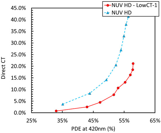Reduction of the random events trigger rate induced by NSB is another important specification for CTA and is strongly dependent on PDiCT. Indeed, in the most common triggering scheme, SiPMs are self-triggered, with the trigger level, Vtr, set at a certain threshold above the single photoelectron level. A higher CT probability increases the chances that a single photon from NSB generates a signal high enough to produce fake triggers. The rate of events caused by NSB depends on spectral filtering of photons impinging on the photo detector and on SiPM PDE, considering that NSB and Cherenkov signal feature different spectra. However, random events can also be strongly attenuated by increasing Vtr at the level of few photons, because the amplitude distribution of single, primary events in the presence of CT decreases almost exponentially with the amplitude. Different analytical models have been proposed for CT, such as, for example, in Reference [31]. On the other hand, since Cherenkov signal is faint, it is beneficial for sensitivity to reduce the triggering threshold as much as possible and to detect photons up to a wavelength of 600–650 nm. Because the NSB photon rate can be very high, the plot of PDiCT vs. PDE can be considered one of the most important inputs to calculate the figures of merit for applications such as CTA.