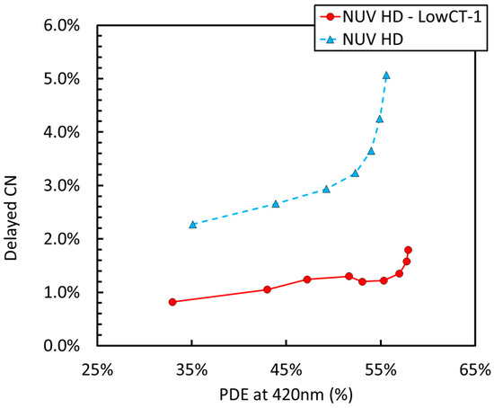 Probability of Delayed Correlated Noise (PDeCN) vs. PDE at 420 nm measured on NUV-HD and NUV-HD-LowCT-1 with 35 μm cell size.
