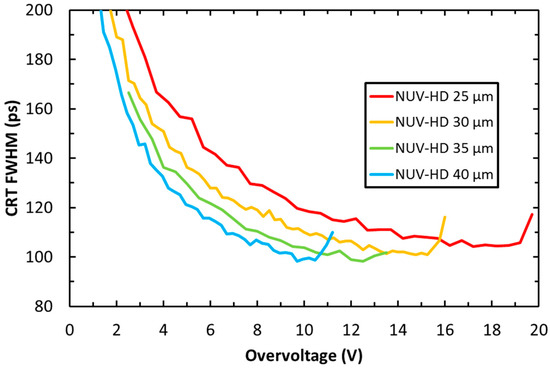 Coincidence reducing time (CRT) as a function of the OV, measured on different cell sizes of the NUV-HD technology.