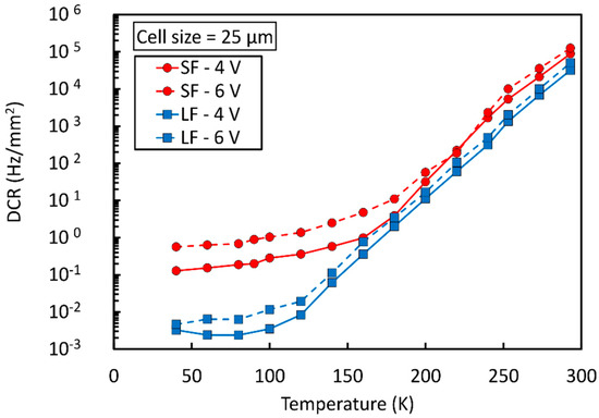 In the high-temperature part of the plot, carrier generation and, thus, DCR, is dominated by field-enhanced thermal generation, described by Shockley-Read-Hall statistics [37]. This is confirmed by an activation energy of 0.43 eV (SF) and 0.48 eV (LF), which can be extracted by the Arrhenius plot calculated from the data in Figure 16. We notice that the DCR of standard-field (SF) and low-field (LF) technologies are comparable near room temperature. The higher value of the activation energy in LF is explained by a lower field-enhanced effect.