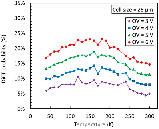DiCT as a function of the temperature and overvoltage for NUV-HD-LF SiPMs. Measures taken from Reference [36].