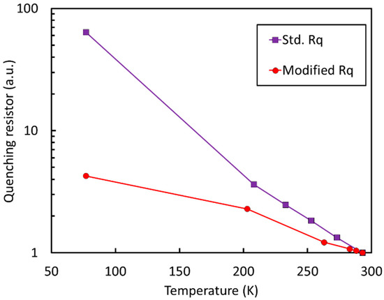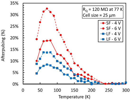The reduction of AP allowed the use of a reduced value of the quenching resistor and, thus, of the microcell recharge time constant at cryogenic temperatures, with significant advantages for the readout electronics. On the other hand, the standard quenching resistor employed in NUV-HD technology is made of poly-Silicon and undergoes significant variations with temperature, changing by a factor of ~60 from 293 K to 77 K. A resistor with a value of ~6.5 MOhm at 77 K would have a value of 100 kOhm at room temperature, preventing correct SiPM operation above 2–3 V, because the avalanche would not be properly quenched [40].