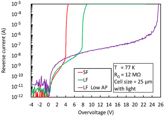 Reverse current-voltage characteristics measured at 77 K for the NUV-SF, NUV-LF and NUV-LF-LowAP SiPM.