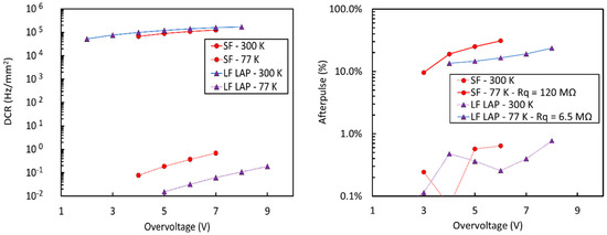 We noticed that the increase of PDE with respect to overvoltage is slower in NUV-HD–Cryo than in NUV-HD, because of the lower field in the high-field region. A setup for measurement of PDE at 77 K is not yet available at FBK, although preliminary measurements showed a reduced difference at 420 nm between values measured at 293 K and 77 K. Because of the absence of direct PDE measurements, noise figures of NUV-HD and NUV-HD–Cryo technologies are plotted as a function of OV in Figure 23. We observed that, even if the afterpulsing probabilities measured at 77 K are not very different in the two technologies, they are obtained with very different microcell recharge time constants (see Table 1).