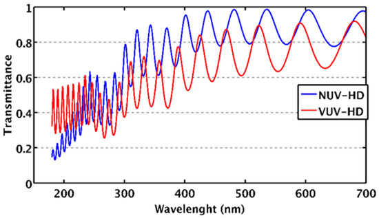 Figure 24 shows the total transmittance in silicon of VUV-HD ARC compared to standard NUV-HD. Optical simulations were carried out under the assumption of normal light incidence and by considering air as surrounding medium. It is worth noting that NUV-HD has a higher transmittance at wavelength >300 nm, but it rapidly decreases at shorter wavelengths, mainly due to Si3N4 absorption. On the other hand, the VUV-HD ARC transmittance remains in the range 30–50% at wavelength <200 nm. The oscillations in the spectrum are due to light interferences in the multilayer stack.