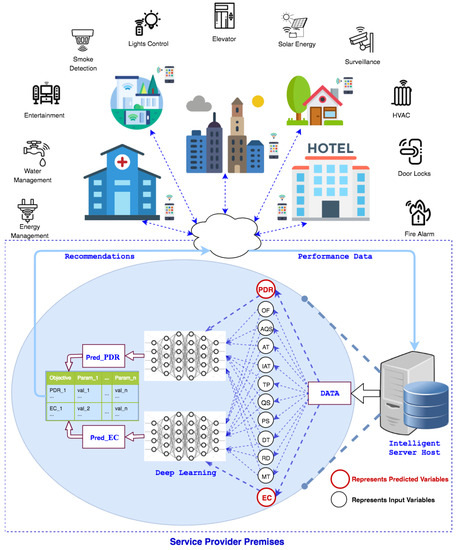 In the proposed work, an IoT enabled IEEE 802.15.4 network for small-to-medium scale buildings is considered (Figure 1). Each building has smart facilities (e.g., energy management, door locks, heat ventilation air-conditioning, security and surveillance, lights, entertainment, and water management) with a central control within the premises which communicates with all smart installations for management operations and control. In addition to regular communication, the performance data consisting of parameters and metrics of interest is periodically transmitted from the site of deployment to the service provider through this central control. A server collects this data and runs deep learning algorithms to identify the relationships between performance metrics of interest ( and in this case) and communication parameters (, etc.), as highlighted in Figure 1. This learning process keeps adapting as different aspects of the network evolve (e.g, change in; QoS requirements, communication parameters including interference, size, and dimensions of the network, and channel quality, etc.), and new data becomes available. Against each performance metric constraint, a set of recommended values for the communication parameters that meet (maximize/minimize) the required goals for the metric are sent to the central controller within the consumer premises. This information is sent in the form of a table as shown in Figure 1. This table contains a set of values for each metric and recommended values for a list of relevant parameters that may help meet the constraint for the metric under consideration. Thus, for the end-device, it is a simple table lookup operation. The controller at the user site uses this information to select the suitable values for the parameters considering performance constraints.