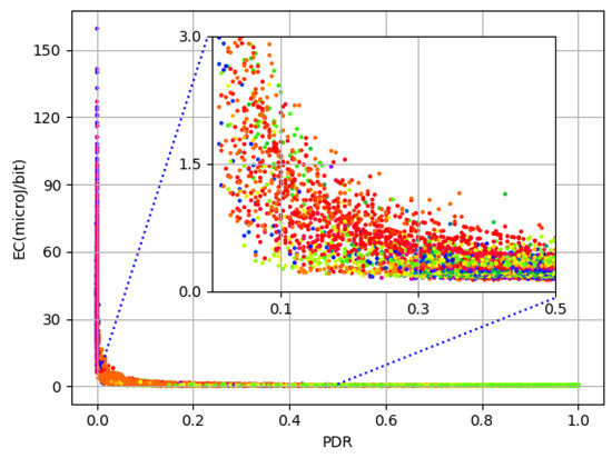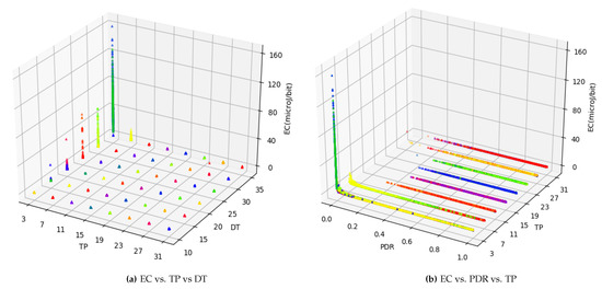 The relationship between and is shown in Figure 2. Being a ratio, ranges between 0 and 1 with median (0.97) close to 1. Both and appear to lie in close proximity but for the lower quarter of values. A zoomed inner frame in Figure 2 reflects this relationship for the bottom half of values. It is evident that there is a rapid hike in as falls below 0.3. This tremendous variation in values can be explained in two ways. First, as losses (radio) increase, energy consumed to transmit for the lost frame gets wasted and thus induces a rise in . Second, although the total number of packets transmitted is 300, depending on the maximum value of (which can be either 1, 3, or 5), the actual number of attempts can be as high as 1500. This phenomenon leads to an enormous positive skew with a very high standard deviation of 7.31 compared to both mean (1.30) and median (0.27) for values. Considering the forward error correction limit of on bit error rate, which is expected to be far less in modern wireless communication systems, a of less than 25% itself remains under question for performance characterization. In order to further understand the parameters working behind the scenes, Figure 3a shows a 3D plot of in relation to and . It is evident that is extremely high when the level is at a minimum (i.e., 3). This is due to the fact that the level is not adequate for successful transmission and, as a result, frames suffer radio losses. This results in increased for successfully transmitted data bits. However, the values for keep decreasing as the decreases. To understand more, Figure 3b shows both and in relation to . It is again clear from the plot that, for a level of 3, and low , there is a visible hike in . Despite this large deviation, in order to consider the entire amount of data, better prepare it for learning, and expect a practical prediction accuracy, these statistics encourage us to split the data based on values. Median based z-score measure is used to decide the split because has a negative skew with median (0.97) being higher than mean (0.87). The formula used to split data is: