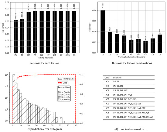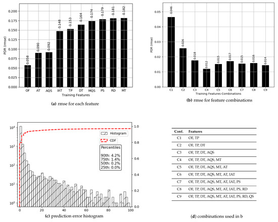 The values for have a high median (0.97), and 76% of those are above 0.80. Prediction results for are presented in Figure 4. True values and predicted values are plotted which lie in a close proximity to the ideal diagonal line. To have a closer look, predicted values for three portions of selected data are plotted against actual values in Figure 5 from three different ranges (0.44 and 0.57, 0.68 and 0.78, 0.93 and 0.94). It is evident that the range shrinks for the same number of data points as gets higher. It is also visible from the plots in Figure 5 that the predicted values are highly aligned with the actual values, in general. In order to better understand the prediction performance, further results are revealed in Figure 6. for individual features are shown in Figure 6a, where , , and yield better prediction accuracy compared to other pre-configured features. This is because directly translates into queuing losses with as an implicit indicator for the potential of the same, whereas directly defines the other (primarily radio) losses that occurred. Therefore, and produce a minimum error because not only do they directly define losses but they also have fine-grained per-packet values compared to the values for pre-configured features. Results for the combination of features are presented in Figure 6b, where five features, namely: , , , and , result in a minimum of 0.012 achieving the overall best prediction accuracy of 98.8% over the range of values. The x-axis label codes, used in Figure 6b, are listed in Figure 6d. Finally, the prediction error is characterized in Figure 6d, where 90% of the predictions have an error of 4.2% or less of the actual values. It is important to note that the addition of any further features after , , , , and does not result in any significant improvement in the accuracy.