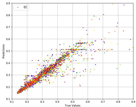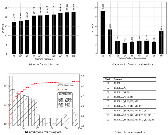 Prediction results are described in Figure 10 and Figure 11. True values and predicted values are plotted in Figure 10, which seem to lie in a close proximity to the ideal diagonal line. However, close to the origin, there is a visible variation. To improve the understanding and to have a closer look, predicted values are plotted against actual values in Figure 11. It is visible that the majority of the predicted values are aligned with the true values. Further outcomes are presented in Figure 12. According to Figure 12a, the order of features in yielding lesser is , , , and . As against , moves to the fourth position and each of the next three features slide a position back. This is due to the fact that more failed transmission attempts cause to go up due to the failure of delivery, resulting in an enormous rise in per data bit, thus superseding the influence of . Overall, reaches its minimum (2.412) with five features. Figure 12b consists of , , , , and , resulting in an accuracy of 88.5% against a mean (21.09) of . The x-axis label codes used in Figure 12b are explained in Figure 12d. The prediction error is characterized in Figure 12c, where 60% of the predictions have an error of 29.8% or less of the actual values. It can be conjectured that deviation, as well as lack of enough data, both contribute to this higher prediction error in split.