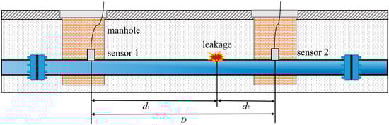 Great efforts have been made to develop leak detection methods, which are mainly divided into hardware- and software-based methods [,,,,,,,,,,,,,,,,,,,,,,,,,,]. When it comes to locating a leak with hardware-based methods, optical fibers and cable sensors can be adopted. In contrast, software-based methods primarily require signals captured by sensors to provide sufficient information about the leak source, such as negative pressure waves and fluid waves. Among these techniques, cross-correlation methods where leak noise is measured at either side of a suspect leak have proved to be effective, and have been widely used to locate leaks in buried water pipelines for many years [,,]. Previous work has shown that the leak noise is concentrated at low frequencies (typically up to 1 kHz for metal pipes and 200 Hz for plastic pipes), with the dominant waveform being the s = 1 wave as the main carrier of vibrational energy induced by water leakage. Moreover, the speed of leak noise can be seen as a constant, with the effect of surrounding soil at low frequencies being negligible []. Currently available cross-correlation leak detection systems operate on passive means to estimate the difference in arrival times between the pertinent acoustic waves measured by two sensors. A wide spectrum involving cross-correlation for time delay estimation (TDE) was first discussed by Knapp and Carter [] and their performance for water leak detection was further discussed by Gao et al. []. More recently Gao et al. [] have investigated the implementation of differentiation process (termed DIF) in the cross-correlation analysis. They showed that the DIF method has the ability to eliminate some of the ambiguity caused by interference at low frequencies, and thus enables a more pronounced and reliable peak of cross-correlation corresponding to the true time delay resulting from the propagating leak noise. On the other hand, Piersol [] showed that the time delay can be estimated by using phase data with no penalty in the form of reduction of prediction accuracy. Zhao and Hou [] extended his work and set up a theoretical frame of the generalised phase spectrum method by using a frequency-dependent weighting function. Brennan et al. [] further validated the equivalence of the cross-correlation methods and generalised phase spectrum methods (i.e., the duality relationship between the time and frequency domains).