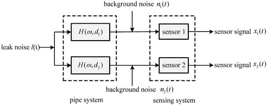 Noise from a leak, l(t), is measured by two sensors, x1(t) and x2(t), as illustrated in Figure 2. Here, H(ω,d1) and H(ω,d2) denote the FRFs between the leak and sensors 1 and 2 respectively; n1(t) and n2(t) are the background noise signals that are assumed to be random Gaussian, and uncorrelated with each other and with the leak signal. The sensor signals, x1(t) and x2(t), can thus be modelled by
