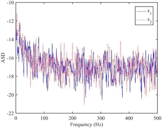 In this section, numerical examples of plastic water pipes are presented to verify the performance of the ADPHAT method proposed in this paper for TDE. In the simulation, both the leak source and background noise signals are white Gaussian with zero means. To emulate the pipe system as illustrated in Figure 2, the parameters of the plastic pipe are set as β = 2 × 10−4 s/m, d1 = 22.8 m, d2 = 38 m, c = 380 m/s. The arrival times of the leak source and the two sensors are calculated to be t1 = 0.06 s and t2 = 0.1 s respectively, which gives the actual time delay T0 = −0.04 s. The simulated leak source signal then propagates downstream and upstream of the pipe system, and is captured at a sampling frequency of fs = 1 kHz. Consider the low signal-to-noise ratio (SNR) case, for example SNR = −10 dB. The ASDs of the resultant sensor signals at d1 and d2 are shown in Figure 4. As can be seen in the figure, the ASDs decrease dramatically with increasing frequency and drop to the level of background noise below 50 Hz, suggesting the simulated signals are concentrated at lower frequencies as anticipated. In the analysis, the possible maximum number for the signals generated is set to be P = 100 in the LMS filter coefficients, as suggested in the appendix. This further yields a reference time delay Tref = −P/fs = −0.1 s, as defined by Equation (11). In the conventional LMS adaptive method, h12(n) denotes the IRF for the input signal x1(t) and the expected signal x2(t); h21(n) denotes the IRF for the input signal x2(t) and the expected signal x1(t). It must be borne in mind that the reference time delay Tref needs to be removed in the estimates of the time delay given by these two algorithms to ensure accurate TDE.