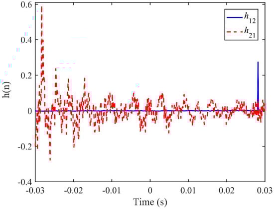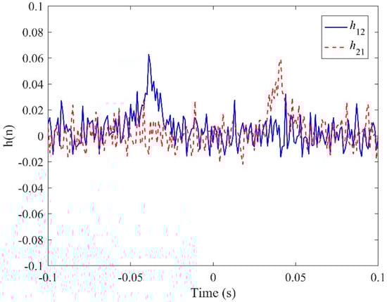 where denotes the FT. For two sensor signals, there are two possible IRFs, h12(n) and h21(n), obtained from x1(t) and x2(t) being the input and expected signals and vice versa. Note that if h12(n) has the maximum values at n = N, then the maximum value of h21(n) occurs when n = −N. In general, a sharp peak in the IRF is desirable for TDE. Correspondingly, neglecting the contributions of the rest terms in Equation (8) is an approximate approach to the FRF between the two sensor signals. This leads to