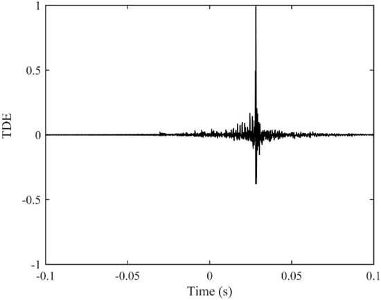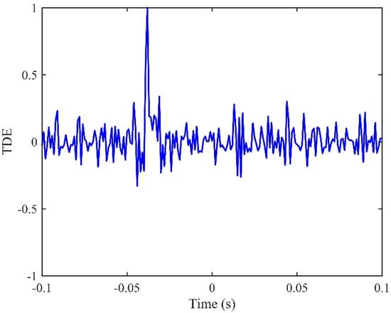 which indicates a pure time delay in the FRF since α is frequency independent. Based on the mathematical model for the two signals defined by Equations (A1a) and (A1b), a recursive method for TDE was proposed where Widrow’s LMS adaptive filter algorithm was applied to compensate for the delay in one of the received signals with respect to the other []. This approach has been referred to as the LMS algorithm that is well documented for reducing the mean square error. In this circumstance, it offers a convenient way to estimate accurately the time delay by searching the maximum value of the IRF.