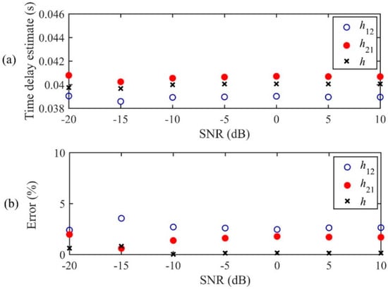 The performance of the LMS adaptive methods for TDE is shown in Figure 8 as a function of SNR. In general, it can be observed that the performance of each adaptive algorithm provides consistency in TDE. As can be seen in Figure 8b, the conventional LMS algorithms, h12(n) and h21(n), lead to errors of 1%~3% in TDE for different SNRs, whereas the new IRF, h(n), with relative error less than 1%, outperforms the IRFs given by the conventional LMS methods. In particular, when the SNR is very poor (SNR = −20 dB), the proposed IRF, h(n), can still achieve very accurate time delay estimate. The reason h(n) gives the best estimate of the time delay is that the leak noise signals are both corrupted by background noise at locations d1 and d2, which can, to some extent, be compensated for by multiplying the two FRFs, H12(ω) or H21(ω), prior to the FT. Furthermore, it must be pointed out that in practice the leak location is unknown, and thus h(n) will also provide an optimal solution for TDE based on the calculated h12(n) and h21(n).