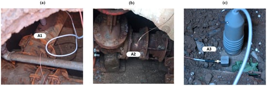 Accelerometers attached magnetically to the test pipe. (a) At access point 1; (b) At access point 2; (c) At access point 3.