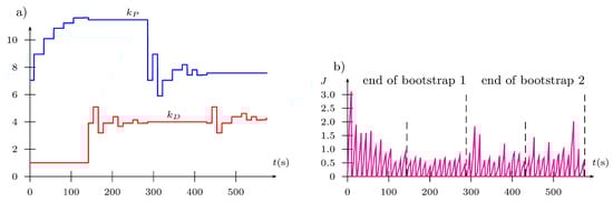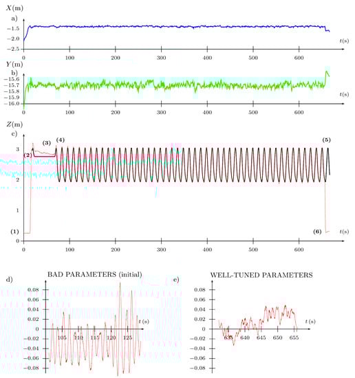 - due to the structure of the algorithm, the FGT method can be used in a single run or performed in stages, in separate flights taking the maximum flight time limited by capabilities of the voltage source in a particular UAV; from authors’ observations, it can be said that provided the UAV has a maximum time of flight approximately equal to 20 min, and the tuning experiment takes about 9.5 min to terminate ( for smooth reference altitude tracking, the experiment can be performed in a single run; however, if a visible voltage drop is observed, resulting in a loss in the effective thrust force of the used driving units, the FGT approach should be used in stages, e.g., the first bootstrap in the first stage, and the second one in the next flight with new batteries;