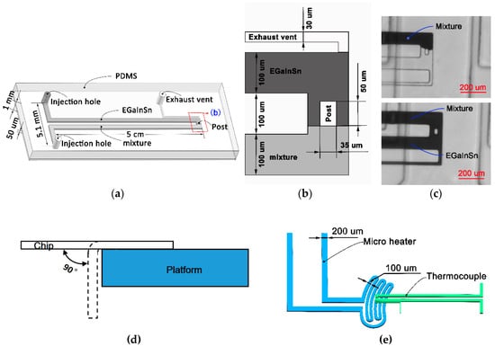Figure 1a shows the microfluidic chip embedded with a handy, flexible micro-thermocouple using low-melting-point metal alloys. This microfluidic chip consisted of a polydimethylsiloxane (PDMS) slab (1 mm thick) and a PDMS membrane (50 μm thick). The PDMS slab had an ohm-shape microchannel (5 cm long, 100 μm wide, and 50 μm high) for the thermocouple. Two identical injection holes were designed 2.5 mm away from the microchannel. One pole of the thermocouple microchannel was filled with EGaInSn, and the other was filled with the Bi-based metal–alloy mixture. The PDMS gap between these two thermocouple poles was 100 μm.