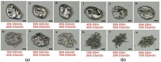 (a) Image of different mass ratios of EBiInSn in mixture. (b) Image of different mass ratios of EBiIn in mixture. With increased mass ratio of bismuth-based alloy, the mixture changes from a liquid to a powdery solid. Scale bars: 1 mm (the experimental mixing videos (S1 and S2) are included in the Supplementary Materials).