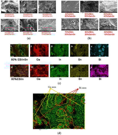 As shown in Figure 3, all the mixtures were scanned in the scanning electron microscope (SEM). Figure 3a,b show the SEM images for the textures of different ratio of bismuth/gallium-based alloy mixtures. In order to reveal the distribution of metal elements, all of these textures were examined through energy dispersive spectrum and Figure 3c shows the results from the alloy mixture with 80% Bi-based alloy. Comparing Figure 3c(ii,cv) or Figure 3c(vii,cx), it is found that the distribution of Ga and Bi is not uniform, and they seem to “repel” each other, which indicates that Ga and Bi do not mix in microscale. Figure 3c(iii) or Figure 3d shows the distribution map of In in 80% EBiInSn. As shown in Figure 3d, the red dashes and yellow dashes represent the area of Bi and Ga, respectively. It can be seen that the distribution of In in the red (Bi) area was much heavier than that in the yellow (Ga) area, which means that the In in the Bi-based alloy did not diffuse into Ga-based alloy. On the contrary, as shown in Figure 3c(iv,cix), Sn distributed almost uniformly throughout the whole area, except in the empty space SEM cannot detect. What should be pointed out is that, in Figure 3c(ix), the Sn was supposed to be absent in the Bi area because EBiIn did not contain any Sn before the mixing. The Sn was still quite uniformly distributed in the whole area, both in Ga–area and Bi–area, which means the Sn entered EBiIn very easily during the mixing. In summary, the Ga-based alloy and Bi-based alloy are thoroughly intermingled with each other and filled the entire space (SEM images for the mixture with other ratios can be found in the Supplementary Materials).