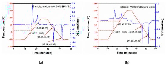 (a) Differential scanning calorimetry (DSC) phase diagram of mixture with 50% mass ratio of EBiInSn. (b) DSC phase diagram of mixture with 50% mass ratio of EBiIn.