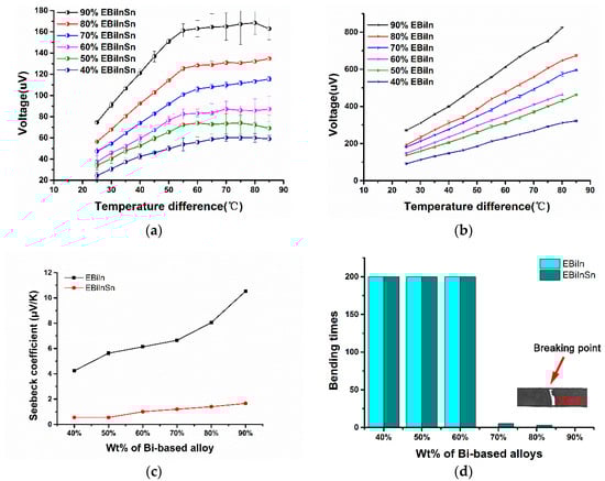 Figure 5c shows the Seebeck coefficients of the EBiIn–EGaInSn thermocouple and the EBiInSn–EGaInSn thermocouple. A higher mass ratio of bismuth meant a higher Seebeck coefficient. The Seebeck coefficient of EBiIn–EGaInSn was also higher than that of EBiInSn–EGaInSn. Among all of these thermocouples, the highest and lowest Seebeck coefficients were −0.55 and −10.54 μV/K, respectively, which were much greater than the previously reported 0.1 μV/K []. However, a high ratio of Bi-based alloy in mixture corresponded to a high Seebeck coefficient of the thermocouples, but they became easily damaged when bent. Figure 5d shows the results of the bending test of these thermocouples. Thermocouples with 40%, 50%, and 60% mass ratios of the Bi-based alloy in mixture still worked well after being bent 200 times continuously. Thermocouples with 70%, 80%, and 90% mass ratio of the EBiIn in the mixture did not present flexibility and were damaged during the first bending test. Thermocouples with 70% and 80% mass ratios of EBiInSn were damaged after bending tests were done, five and two times, respectively. The thermocouple with 90% mass ratio of EBiInSn was also damaged after the first bending test. The decrease in mass ratio of the Bi-based alloy in the mixture improved the flexibility of the thermocouples. In other words, because of the presence of the room–temperature liquid–metal EGaInSn in the mixture, the thermocouple eliminated the brittleness of bismuth and was thus flexible and bendable. In microfluidic systems, when a thermal microchip requires thermocouples with high flexibility, the mass ratio of Bi-based alloy in the mixture for the thermocouple can be suggested to be <60%. After the bending test, the undamaged thermocouple was tested again. Compared to its state before bending, the thermocouple’s Seebeck coefficient was nearly equal (see Supplementary Materials).