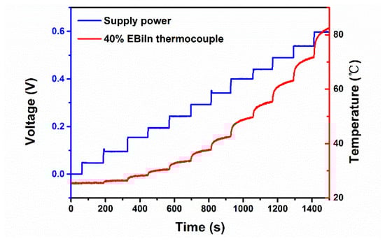 The thermocouple with 40% mass ratio of EBiIn was chosen to measure the temperature of EGaInSn microheater. Using the calibration curve (Figure 5a), the voltage signal collected by the liquid-metal thermocouple was converted into a temperature signal. The test was performed at 25 °C. Figure 6 shows the experimental results of temperature measurement for the liquid-metal microheater. With increased voltage by 0.5 V per test, the thermocouple monitored the temperature change over time. When the voltage reached 0.65 V, the temperature of the microheater was 83 °C. These findings indicated that this thermocouple worked well below 83 °C.