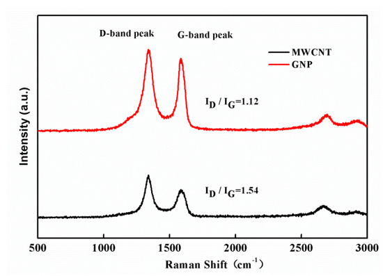 In this work, MWCNTs prepared by the CVD method (length: 0.5–20 μm, thickness: 1–10 nm; Uchees Co., Taipei, Taiwan) and GNPs (diameter: 10–50 nm, length: 100–200 μm, carbon content: >98.5%; Conjutek Co., Taipei, Taiwan), were used to fabricate the hybrid films with different GNP weight ratios. Raman spectrum were obtained by a Raman spectrometer (Invia Reflex, Renishaw, UK), using a 532 nm laser source to evaluate the structure and quality of the MWCNT and GNP as shown in Figure 1. The D and G band peaks were the two most prominent characteristic peaks which represent the disordered sp3 structure and the sp2 hybridized graphitic structure, respectively. The intensity ratio of D band and G band can be calculated to characterize the quality of graphitic crystalline structures. The ID/IG of GNP and MWCNT are 1.12 and 1.54, respectively. This indicates that GNP is better than that of MWCNT, in terms of the crystalline structure.