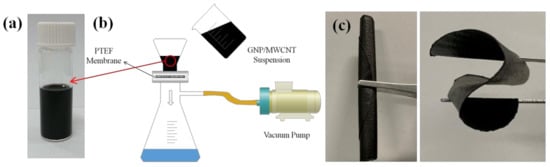 (a) MWCNT/GNP hybrid suspension, (b) schematic diagram of vacuum filtration, and (c) a flexible GNP/MWCNT hybrid film.