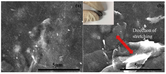 The surface morphologies and cross-section views of the hybrid film with 0 wt% (GNP-0) and 50 wt% (GNP-50) of the GNPs are presented in Figure 4 and Figure 5, respectively. Figure 4b clearly shows that MWCNTs were randomly oriented, and the long and tortuous MWCNTs were entangled with each other, forming a dense percolating network, and were homogeneously dispersed for the GNP-0 (0 wt% GNP and 100 wt% MWCNT) film, without any visible agglomeration. Some of the GNPs could be observed on the surface of the GNP-50 film (50 wt% GNP and 50 wt% MWCNT), and the GNP layers could conformably spread on the voids of the CNT network, as shown in Figure 5b.