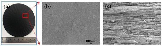 The microstructures of the hybrid films were characterized using a field emission scanning electron microscope (JSM-7600F, Jeol Ltd., Tokyo, Japan), and the samples were sputter-coated with a conductive gold layer, before obtaining the images. As shown in Figure 4a, a flexible film with a diameter of 80 mm and thickness of approximately 70 μm, was obtained. The hybrid film exhibits a metallic luster as the GNP content increases. This can be indicative of the intrinsic semiconducting behavior of the graphene [28].
