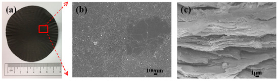 GNP-50 film with 50 wt% graphene and 50 wt% MWCNT; (a) the prepared film, (b) surface morphology SEM image, and (c) cross-section SEM image.