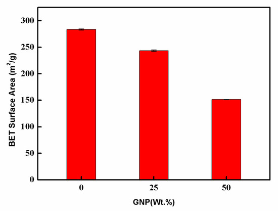 The MWCNT/GNP hybrid film had a well-defined porous sandwich structure. To confirm the effect of the GNP on the creation of a porous structure, the surface area was measured by Brunauer-Emmett-Teller (BET) theory, as shown in Figure 7. The pore size distribution, using the Barrett-Joyner-Halenda (BJH) method based on nitrogen adsorption–desorption (ASAP2460, Micromeritics Corp., Norcross, GA, USA), is presented in Figure 8. The BET surface area decreased from 283.53 m2/g to 151.31 m2/g, as the GNP content increased from 0 to 50 wt.%. The pore distribution of the hybrid film was in the range of 5–25 nm. As expected, the total pore volume consistently decreased with an increasing GNP content.