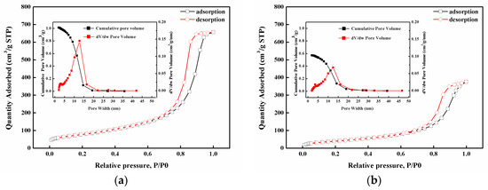N2 absorption–desorption isotherms. Insets show the BJH pore size distribution. (a) GNP-0 with 0 wt% GNP and 100 wt% MWCNT and (b) GNP-50 with 50 wt% GNP and 50 wt% MWCNT.