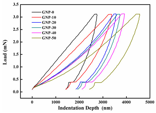 In the nanoindentation tests, the Berkovich indenter was impressed into the hybrid film surface, under an increasing load, at a constant speed of 0.3 mN/s. After it reached a pre-determined maximum load of 3 mN, the sample was held under the peak force for 10 s, to minimize the time-dependent plastic effect. For each film, at least three points were measured. The representative load–indentation depth curves of the hybrid films, with different GNP contents, are compared in Figure 9. The GNP-0 film shows the highest resistance to indentation force with the lowest maximum indentation depth. It can be observed that the load–indentation depth curves were shifted to the right (which implies a larger indentation depth for the same load), as the GNP content increased. Moreover, the unloading curves exhibited discontinuities and small steps, which indicated that some cracks formed during indentation [32].