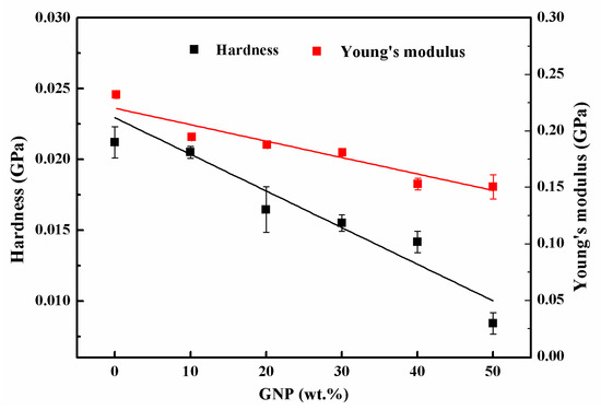 The hardness and Young’s modulus of the hybrid films extracted from the load–indentation depth curves are presented in Figure 10. It can be seen that both the hardness and Young’s modulus decreased with increasing GNP content. The hardness and Young’s modulus of GNP-50 decreased by 151.78% and 54.43%, compared to that of GNP-0, respectively. These results could be inferred from the cross-view SEM images, which revealed that the graphene sheets were mainly assembled by an in-plane contacting π–π interaction or van der Waals force, without any strong mechanical interlocking. However, the MWCNT bundles connected with each other through entanglement and formed a strong robust network. In addition, further increasing the graphene content led to a parallel decrease in the carbon nanotube axis directions, due to the excessive graphene loading, which deteriorated the structural integrity and destroyed the mechanical strength of the hybrid film [2].