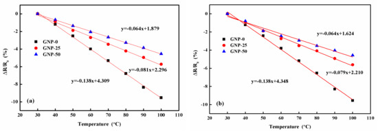 Figure 11 plots the normalized relative resistance change versus temperature for the hybrid films, with different GNP contents in the atmosphere environment, with a relative humidity of 70%, and in a vacuum oven. It can be observed that the resistance vs. temperature curves in the atmosphere environment (Figure 11a) and a vacuum oven (Figure 11b) were the same. The resistance change was mainly attributed to the temperature change, while the ambient humidity did not affect the resistance of the hybrid film. The electrical resistance decreased with an increase in temperature, which indicated a negative piezoresistive behavior of the hybrid film. The TCR could be obtained from the slope of the curve. The values of the TCR for the hybrid films, with GNP contents of 0 wt%, 25 wt%, and 50 wt% were −0.1373%/°C, −0.0786%/°C, and −0.0644%/°C, respectively. The temperature sensitivity of the hybrid film decreased with the increase of the GNP content [37,38]. The TCR of the proposed hybrid film was similar to that of the MWCNT temperature sensor reported by Liu et al. [10], with a temperature sensitivity (TCR) of −0.068%/°C.