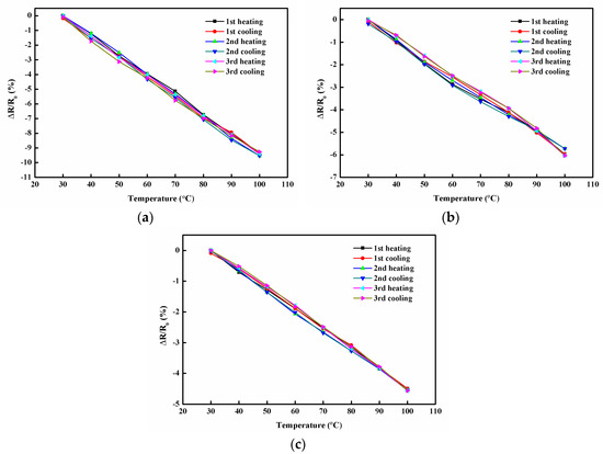 Furthermore, to investigate the reliability and stability of the hybrid film as a temperature sensor, the hybrid films were subjected to cyclic heating and cooling tests, as illustrated in Figure 12. No obvious change was observed in the △R/R0 vs. temperature curves, which demonstrated the high stability and durability of the hybrid film for the temperature-sensing application.