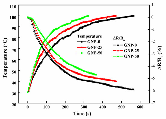 Hybrid films with three different GNP weight percentages of 0 wt%, 25 wt%, and 50 wt% were placed in an oven, at 100 °C. Figure 13 illustrates the temperature and resistance responses of the hybrid films. It shows that the response time decreased with the increase of the GNP content. GNP-50 with 50 wt% of GNP exhibited the fast response time of 340 s, as the temperature increased from room temperature to 100 °C, while GNP-0 possessed the slowest response time of 500 s. This could be attributed to the increase of the thermal and electrical conductivities by the incorporation of GNPs. A similar trend could be observed for the resistance change of the hybrid films, which indicated that the temperature and resistance changes were significantly synchronized.