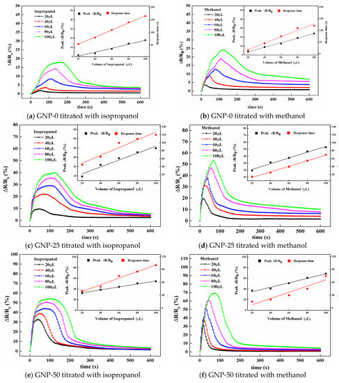 Figure 15 plots the resistance changes of the hybrid films titrated with different amounts of isopropanol and methanol solvents. All the curves demonstrated a similar pattern. Li et al. [8] reported a similar curve for carbon nanotube buckypapers. The resistance response of the hybrid film could be divided into two stages, namely, infiltration and evaporation. In the first stage, the resistance increased with time, until it reached the peak value, which corresponded to the infiltration of the solvent. Upon infiltration, the penetration of the small solvent molecules between the MWCNTs and GNPs, due to the strong capillary effect, formed at the MWCNT-molecule-GNP junctions, which induced the barrier to be tunneled through solvent molecules, for conduction. Furthermore, the distance between the MWCNTs and GNPs increased, resulting in an increase of the tunneling barrier. Thus, a significant increase of the resistance was observed. In the second stage, the solvents were evaporated, the barriers for tunneling conduction, through the MWCNT-molecule-GNP junctions, were reduced. The resistance was gradually recovered. The peak value of the resistance changed and the time to reach the peak are presented in the inset of Figure 15. It appears that both the maximum resistance change and time to reach the maximum linearly increased with an increase in the amount of solvent infiltrated into the film. The resistance change of the hybrid film infiltrated with methanol was larger than that of isopropanol, while the response time was less than that of isopropanol. This could be attributed to the low conductivity and viscosity of the methanol, in comparison with isopropanol. The resistance change and response time were relative to the conductivity and viscosity of the organic solvent, respectively.