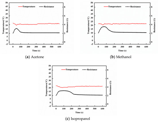 Temperature and resistance responses of the hybrid film GNP-50 titrated with 100 μL of acetone, methanol, and isopropanol.