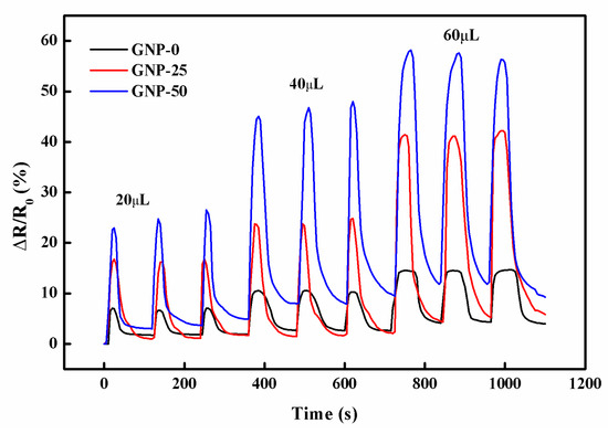 The temperature variations of the hybrid film, during the titration of the organic solvent, were measured. Figure 16a–c plot the temperature and resistance responses of the hybrid film GNP-50, titrated with 100 μL of acetone, methanol, and isopropanol, respectively. The maximum temperature changes of the hybrid film titrated with acetone, methanol, and isopropanol were 2.9 °C, 3.1 °C, and 2.8 °C, respectively. The effect of the small variation of the temperature on the resistance change, during infiltration, can be neglected. Thus, the resistance change was mainly due to the penetration of small solvent molecules into the hybrid film.