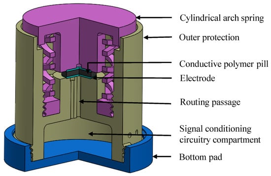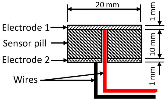 Transmission losses in the output signal and noise can be generated at the contact points between the sensor pills and electrodes. Two copper clad foils were used as electrodes while a layer of silver paste layer [] is used in between the conductive polymer pill and the electrodes to minimise the above-mentioned phenomena (Figure 13). This novel wire piercing design method has significantly eased the routing provisions inside the sensor packaging, thus simplifying the packaging structure.