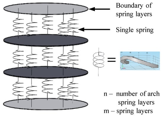 The arch spring structure was simplified to a parallel and series spring system and used to introduce further modifications to the spring structure. The simplified analytical model is shown in the Figure 4 and it is equivalent to the proposed design seen in Figure 1. The number of arch spring layers are represented as “n” (which have been depicted as , , …‥ and in Figure 3 for the proposed structure). The number of parallel springs between two boundaries (shown in Figure 4) of the spring layer are indicated as “m”. Equation (1) would give the representation for the axial spring constant of the spring structure: