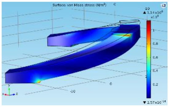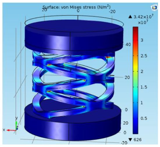The FEA study was carried out using the COMSOL Multiphysics 5.0 to justify the analytic model for the same model used for the structural simulation (shown in Figure 5). In the analysis conducted for the single cylindrical arch spring Figure 6, a force component is given to the topmost surface of the spring in order to calculate the maximum deformation. Stiffness for a single cylindrical arch and the entire spring structure (without the consequence of the sensing element) were derived as 25,673 N/m and 10,888 N/m, respectively. Equation (1) could be verified by the above results with an error percentage of 6.02%. whose causes could be the assumptions of the equations and the round-off errors in the FEA study.