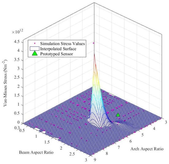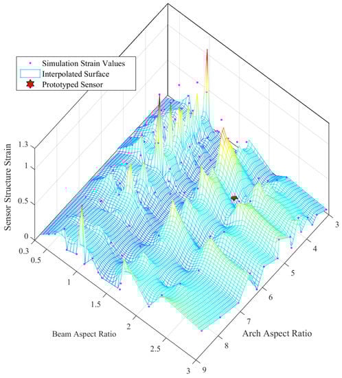 Considering the Arch Aspect Ratio (=arch width/arch height) and the Beam Aspect Ratio (=beam width/beam height), which are two major design parameters, a parametric study was conducted with adaptive mesh refinements for each parametric step. Figure 8 and Figure 9 depicts the results of the parametric study and status of the prototyped cylindrical arch spring structure. Hence, this parametric design methodology (the results of the parametric study) could be adhered to by a sensor designer in order to obtain the desired characteristics out of a sensor by altering the structural parameters. Dimensions of the sensor packaging and application specific constraints must also be considered. Despite the validated single arch spring, the entire cylindrical arch spring structure should be thoroughly validated by simulations in order to be fail-safe prior to the fabrication, as the arch crevices are the areas with the highest stress concentration.