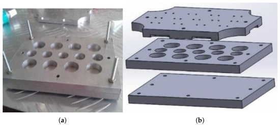 Mould used to fabricate sensor pills: (a) aluminium—press mould; (b) exploded view of the mould.